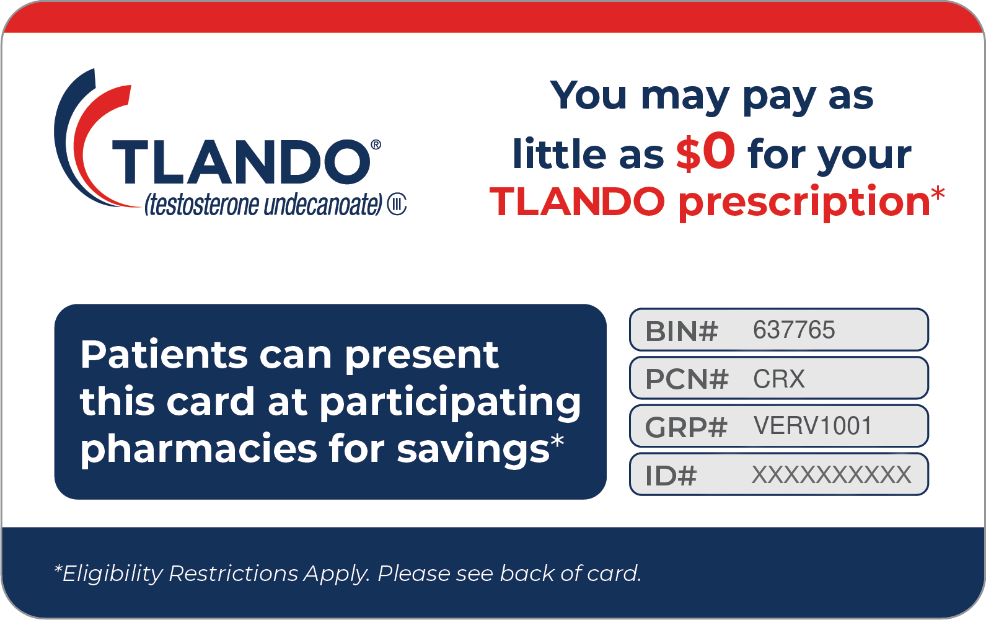 *Eligibility Restrictions: Offer only valid for patient with a valid prescription for TLANDO. Offer is valid for as long as patient is on therapy and may be subject to change. Maximum benefits apply. Offer not valid for prescription reimbursed under any federal or state healthcare program, including but not limited to, Medicare, Medicaid, TRICARE, Veterans Affairs, or any state medical assistance programs. Offer void where prohibited by law, taxed, or restricted. Offer only valid in the USA. Verity Pharma, Inc. reserves the right to rescind, revoke, or amend this offer at any time without notice. Patients agree to comply with any of the terms of their health insurance including any requirements to notify their insurance of any assistance received under this program. By using this co-pay assistance card, you demonstrate that you understand and agree to comply with the terms and conditions of this offer as put forth on this co-pay assistance card.